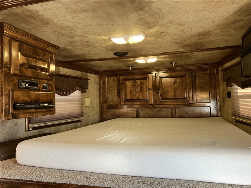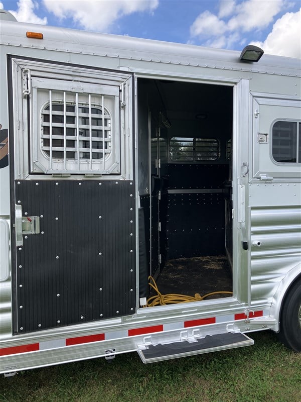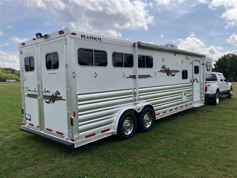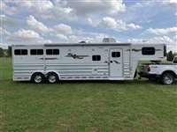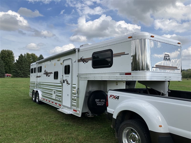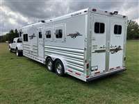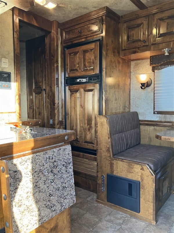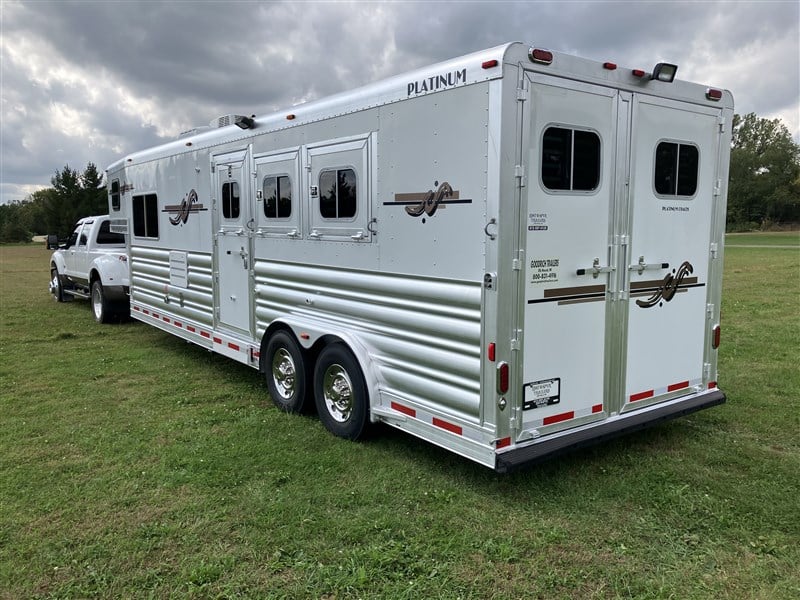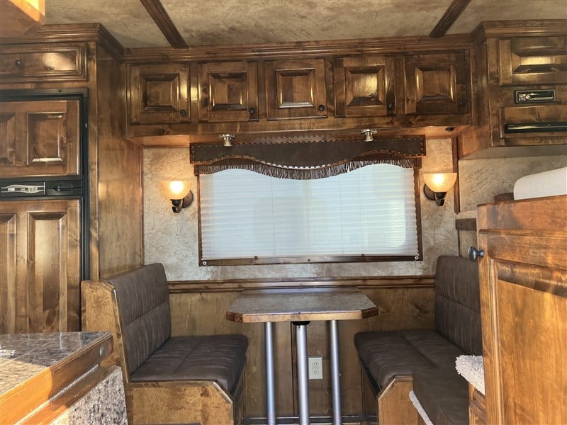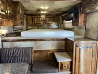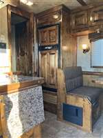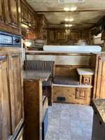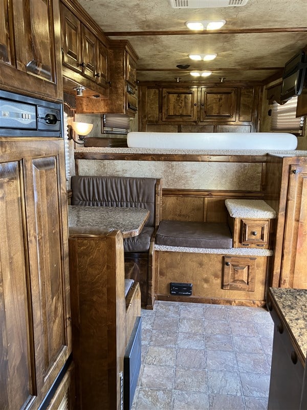 LOST SPUR TRAILERS Justin beautiful 2009 platinum three horse slant with 12 foot outlaw living quarters electric jacks, new 14 ply tires, escape door and first stall, dropped on windows with separate face guards, fold up rear tack, beautiful, knotty Alder, interior convection, microwave porcelain stool, 6 ft.³ fridge with separate freezer, TV Soundsystem, dinette, converted all interior lights to LED
