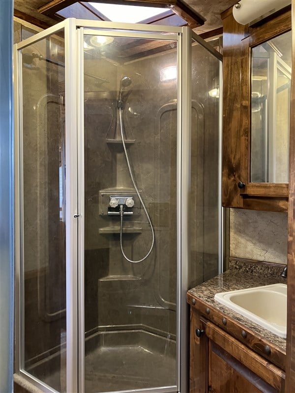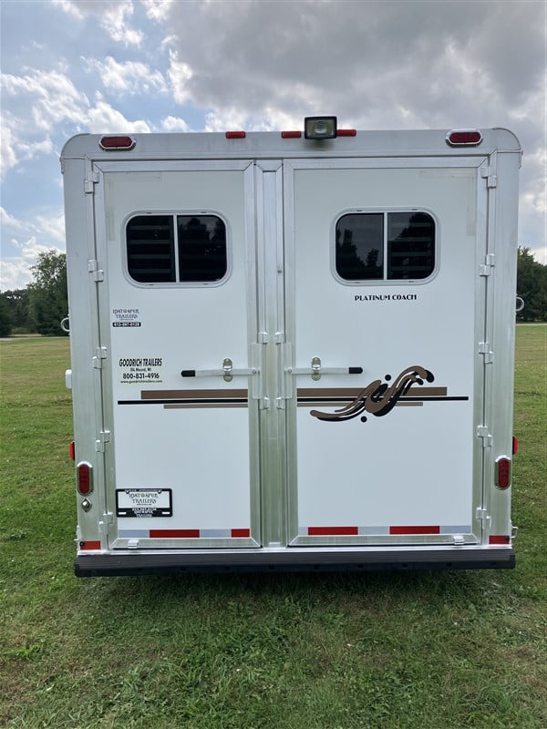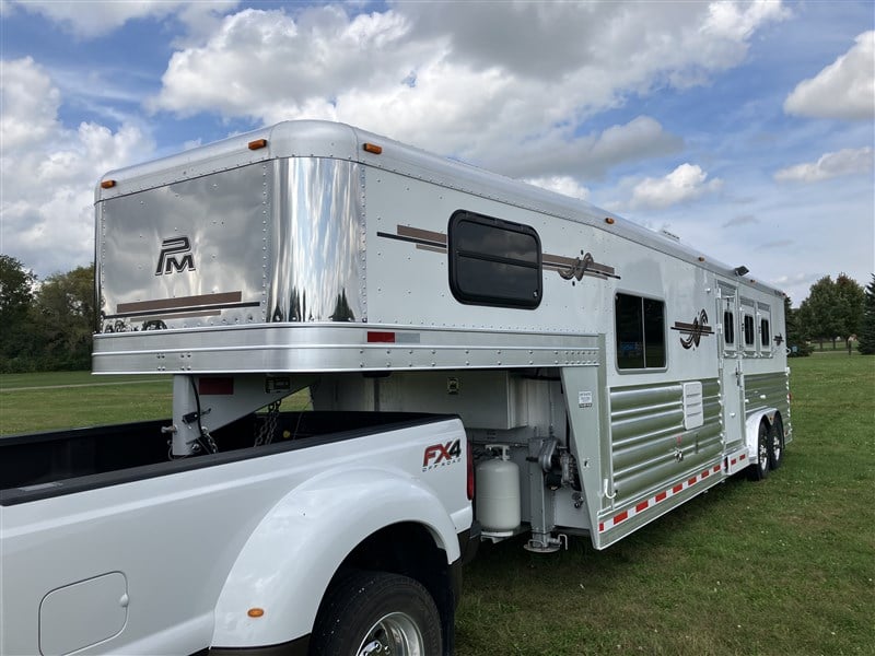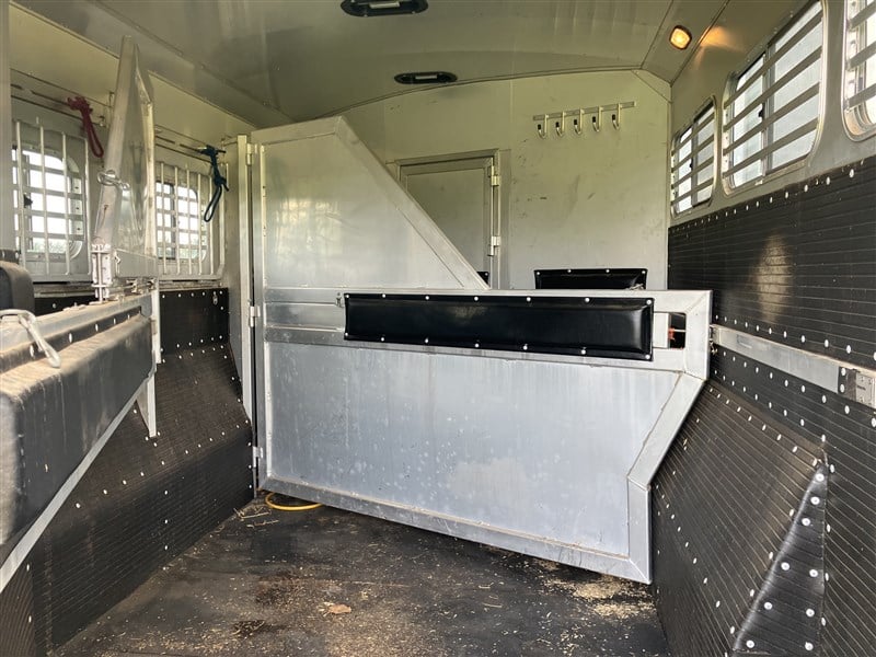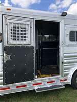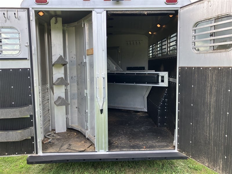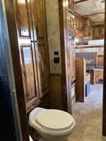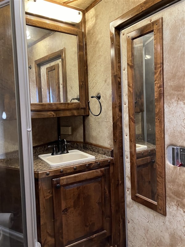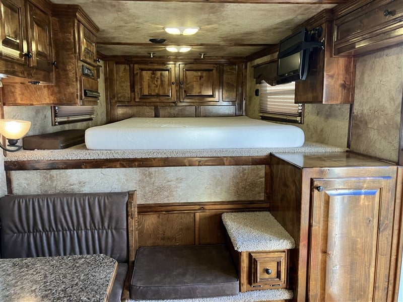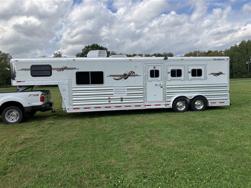LOST SPUR TRAILERS Justin beautiful 2009 platinum three horse slant with 12 foot outlaw living quarters electric jacks, new 14 ply tires, escape door and first stall, dropped on windows with separate face guards, fold up rear tack, beautiful, knotty Alder, interior convection, microwave porcelain stool, 6 ft.³ fridge with separate freezer, TV Soundsystem, dinette, converted all interior lights to LED
