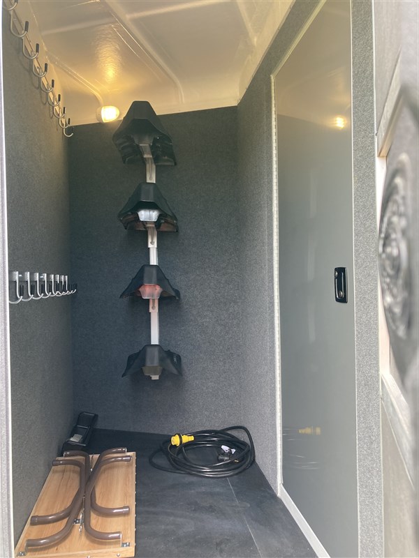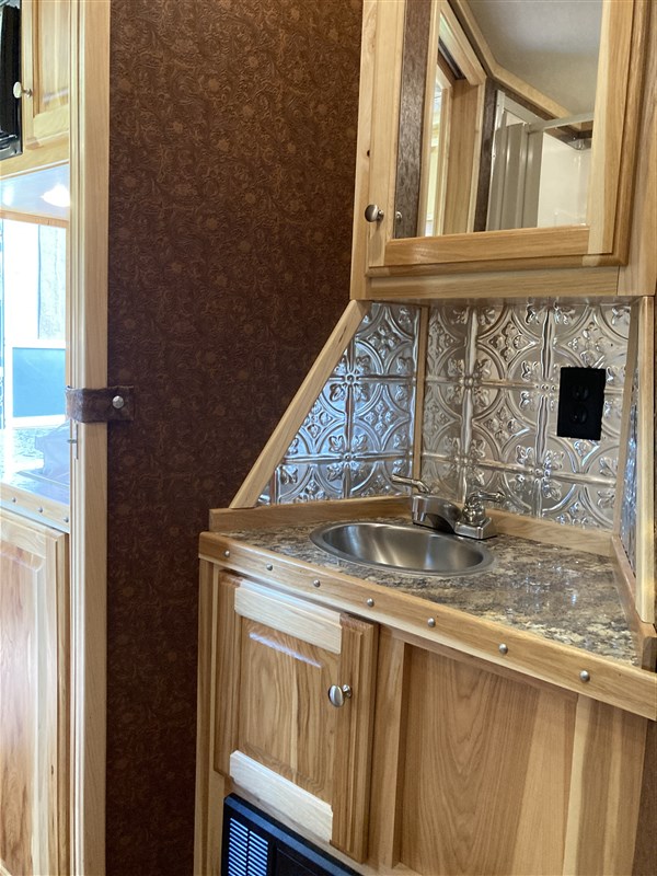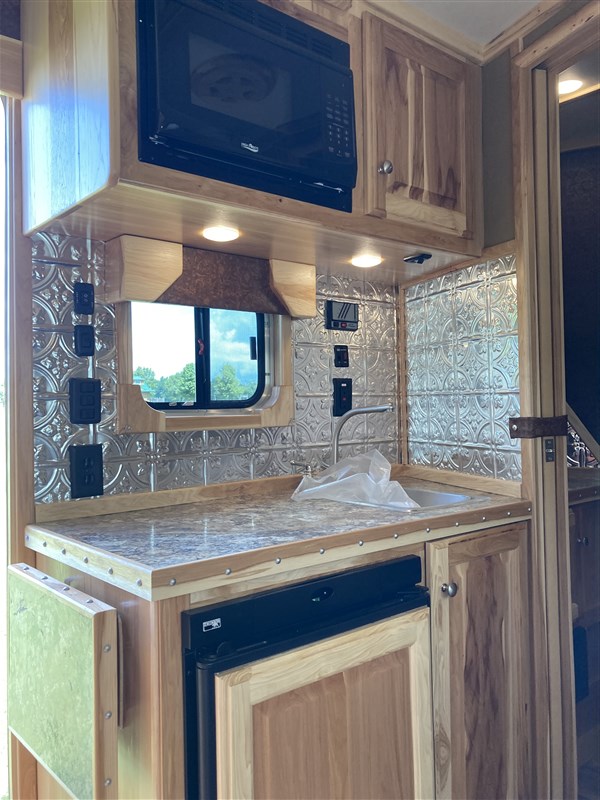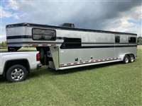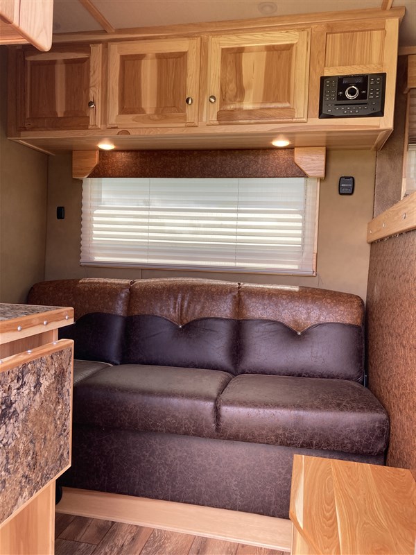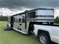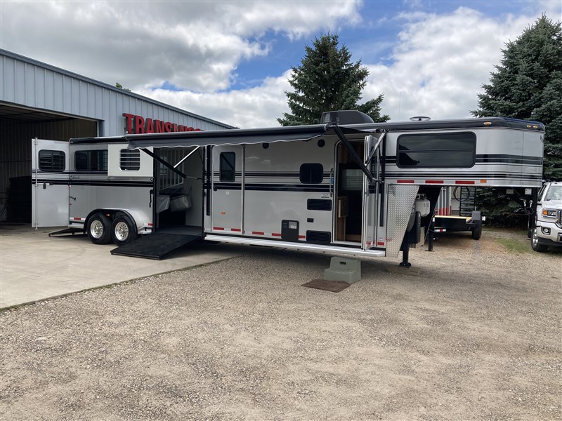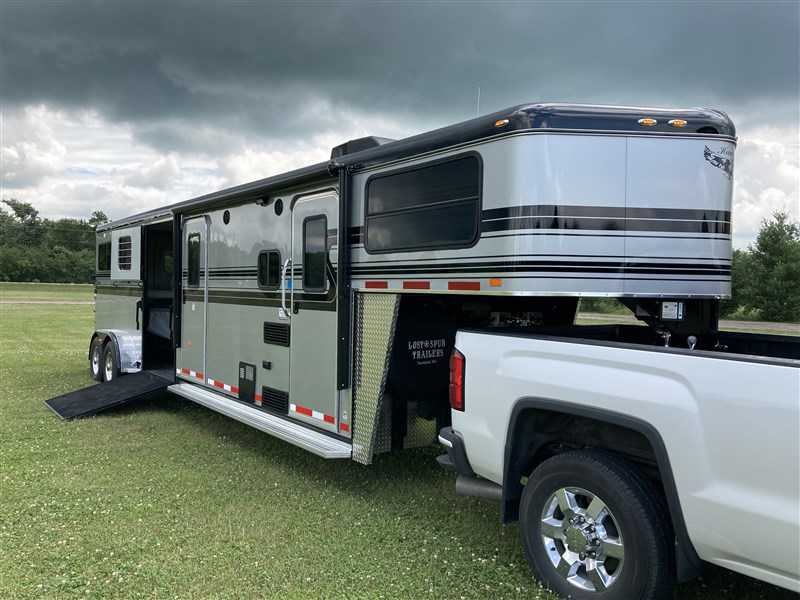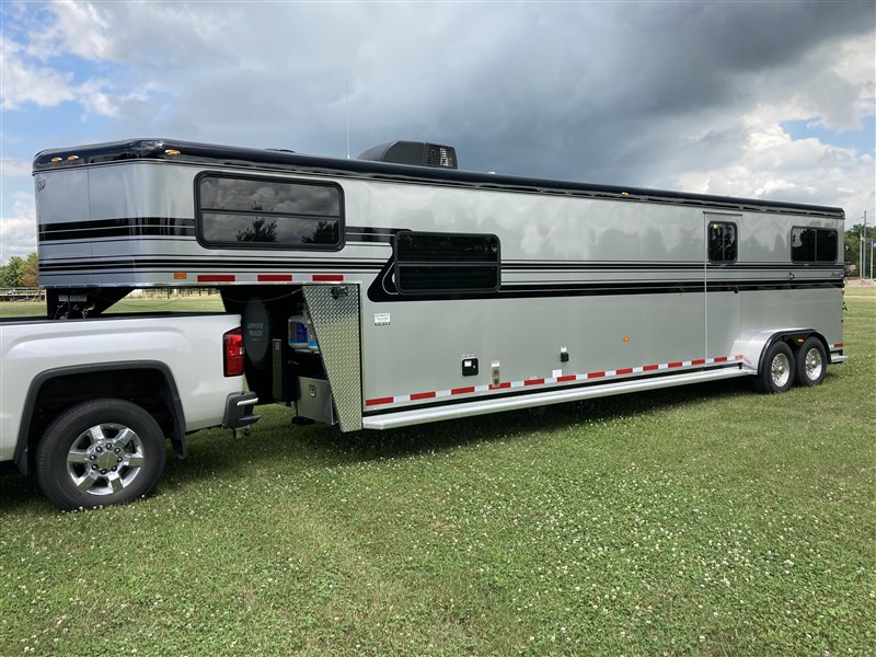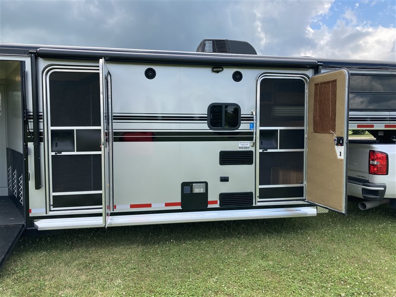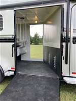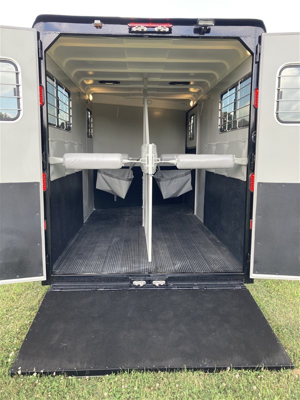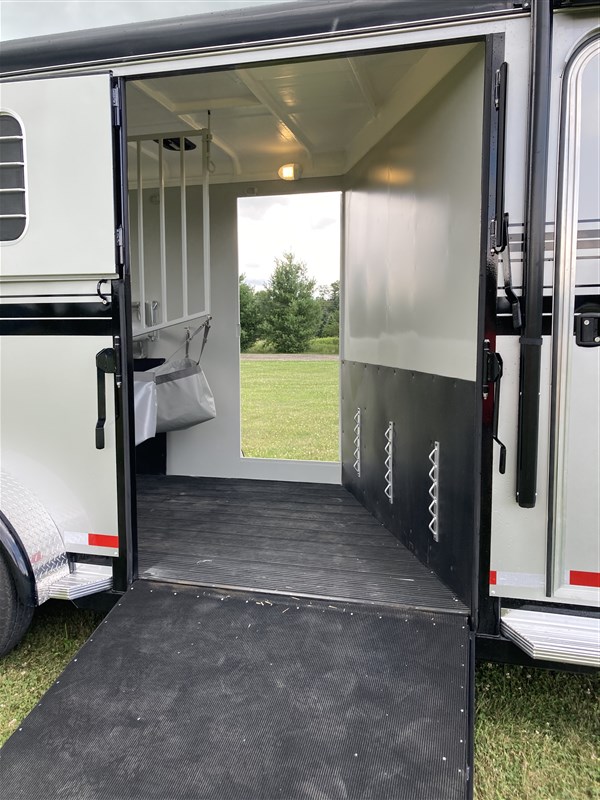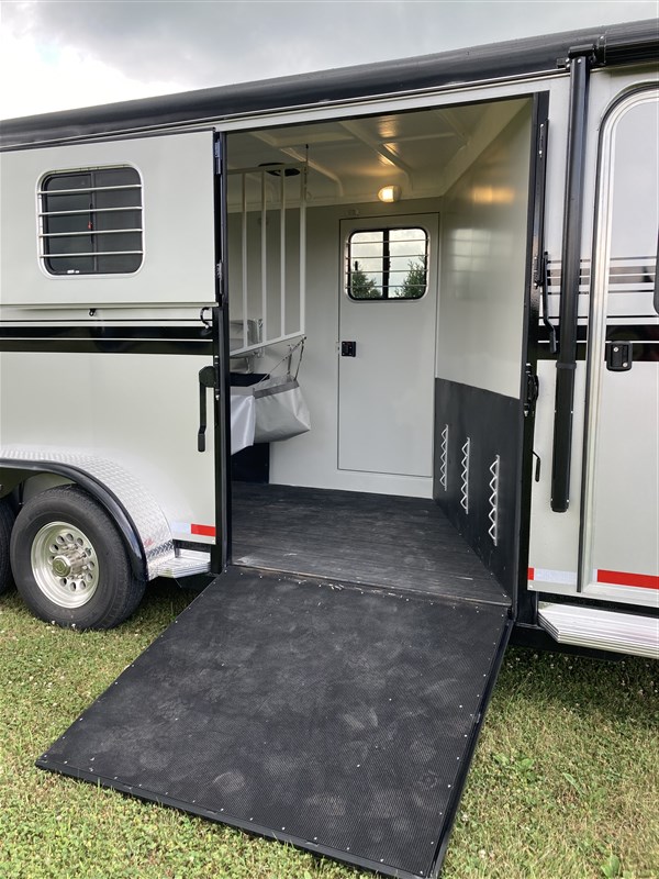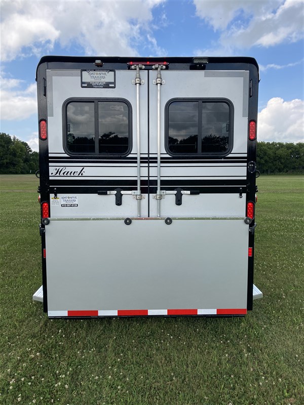 2021 Hawk Elite 2 horse side ramp mid tack with 11 foot living quarters, 80 inches wide, 7‘6“ tall, escape door, side ramp, rear ramp, walk-in mid tack, lots of bridal hooks, saddle rack, extra blanket bars, walk-through to bathroom, solid hickory interior, soft touch walls and ceiling power awning 12,500 BTU AC ducted, hydraulic jack, balance of factory warranty. Only been used three times.